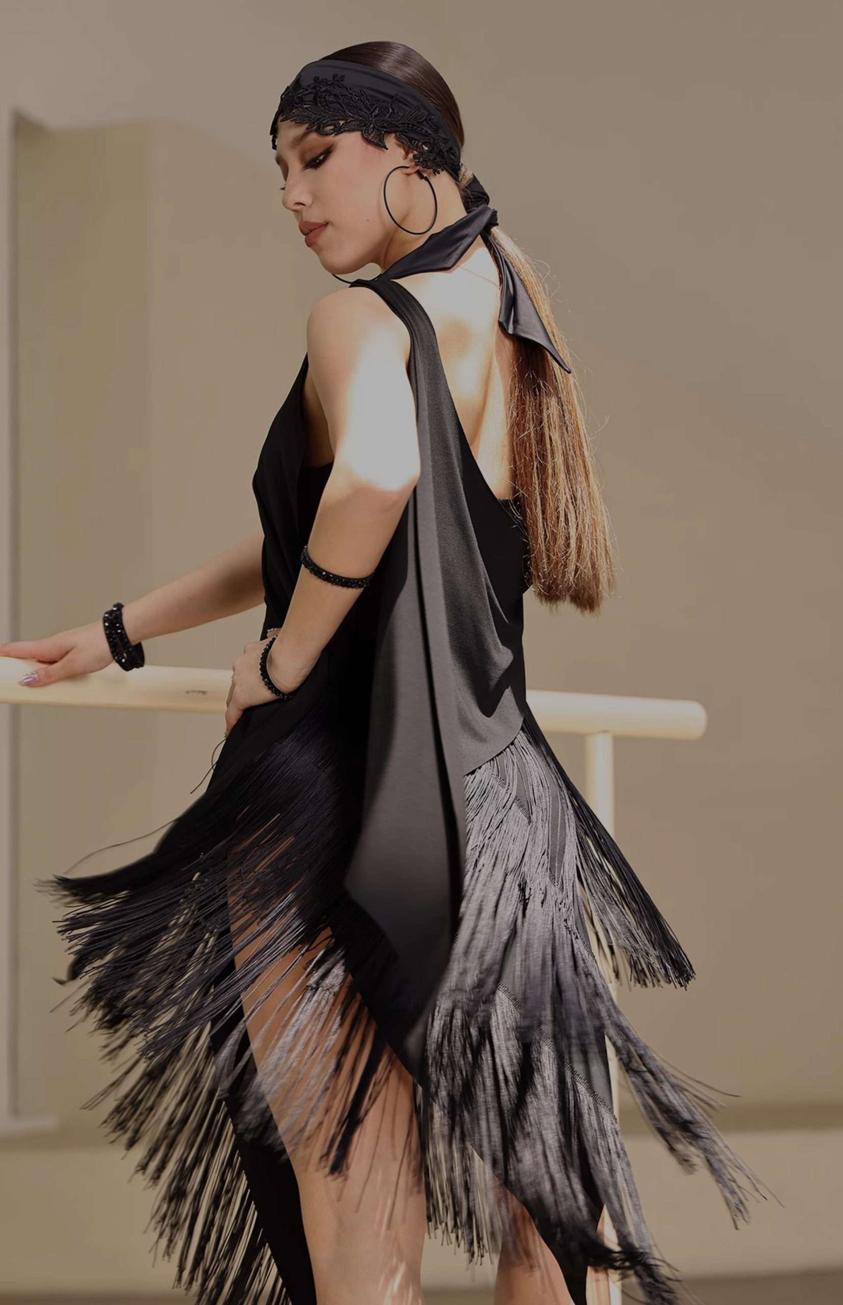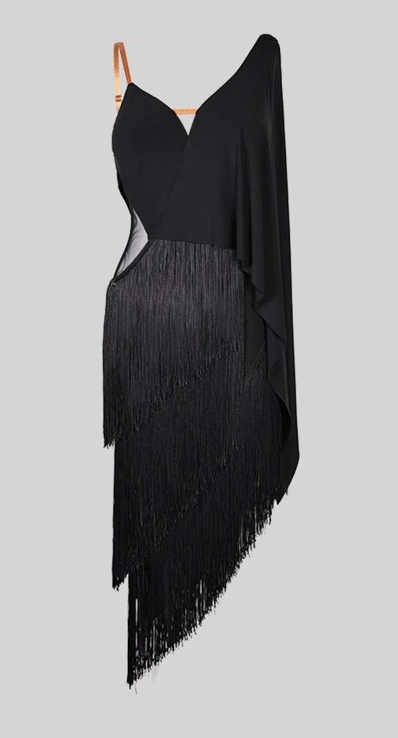 Il modello A18 con tessuto  elasticizzato, frange e voilant.